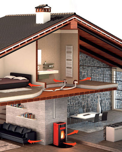 Multifuoco System ® može postati idealan sustav za zagrijavanje cijelog vašeg doma zahvaljujući jedinstvenom sustavu kanaliziranja zraka. On omogućava vođenje toplog zraka i do udaljenih prostorija ili prostorija na drugoj etaži, pri čemu možete biti sigurni da ćete postići jednak komfor kao i u prostoriji u kojoj se nalazi peć. Sustav kanaliziranja omogućava vođenje zraka do udaljenosti od 16 metara kod uređaja na pelete ili 10 metara kod uređaja na drva.